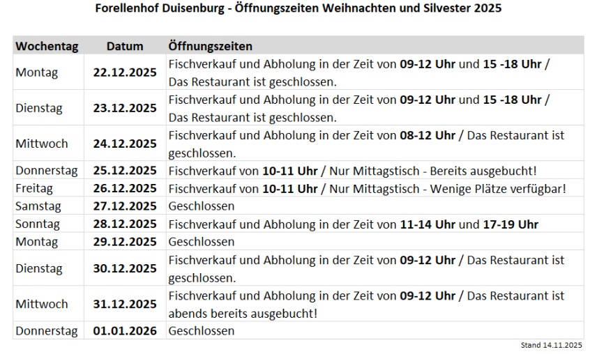 In der Preisliste finden Sie eine Übersicht über die Auswahl der von uns angebotenen Forellen- und Räucherfischspezialitäten aus unserem Hause. Bitte beachten Sie, dass nicht immer alles vorrätig ist und wir eine Vorlaufzeit von mindestens zwei Tagen benötigen um Ihre Bestellung in unseren Arbeitsabläufen zu berücksichtigen.Forellen- und Räucherfischspezialitäten können zu den Öffnungszeiten des Restaurants abgeholt werden.
