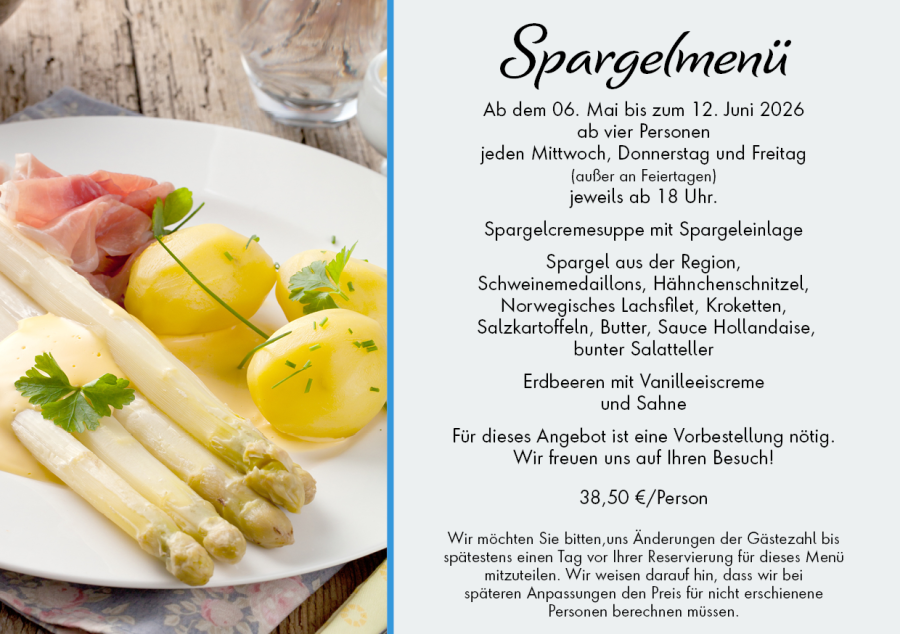 Das Spargelmenü bieten wir für Gesellschaften ab vier Personen zum Preis von 38,50 € pro Person an.